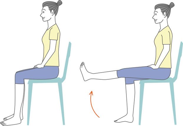 (2) 右足を上げて前に伸ばし、つま先を天井に向ける(イラスト右)