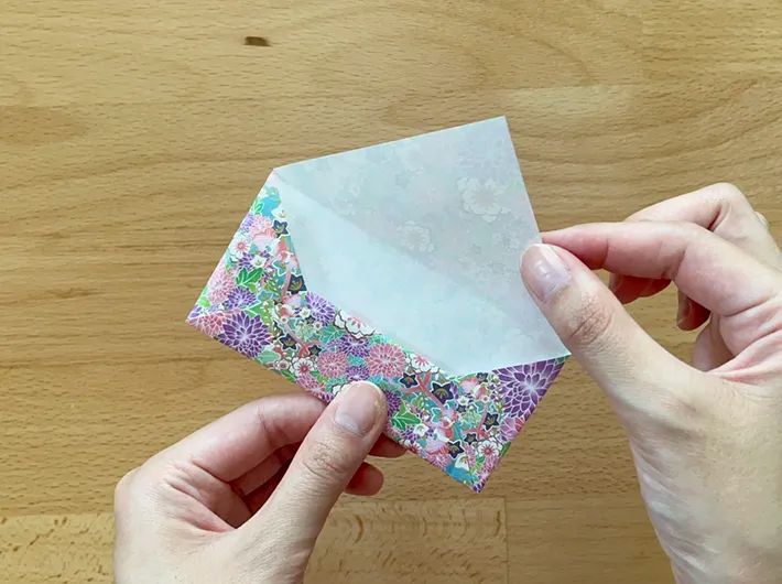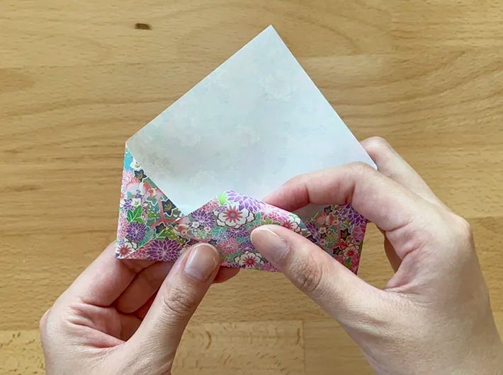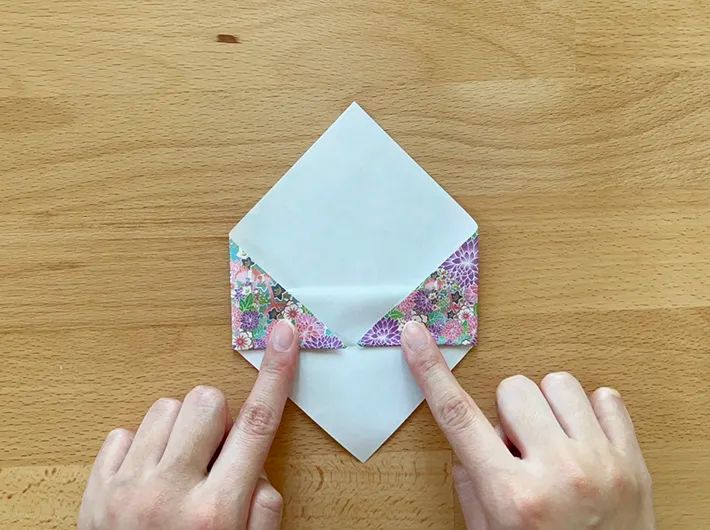 次に、自分側にある小さな三角を折りましょう。封筒のような、袋状になりますよ。