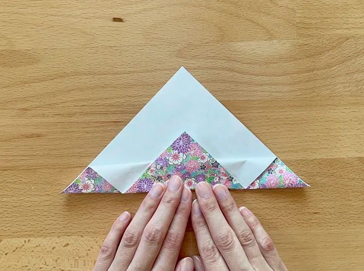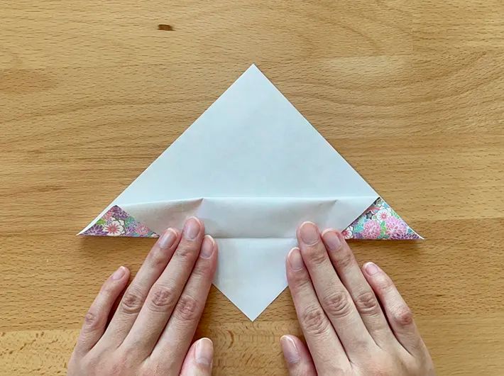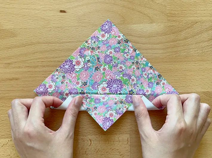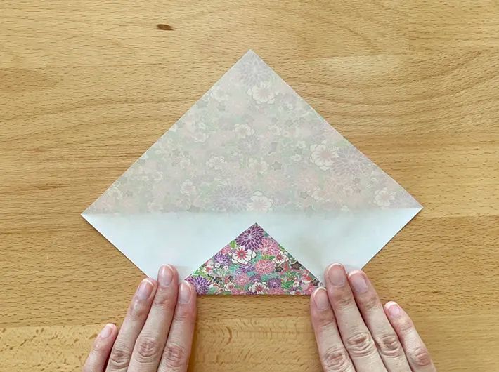 そのまま裏返し、小さな三角の底辺が、最初につけた折り目に合うように折りましょう。