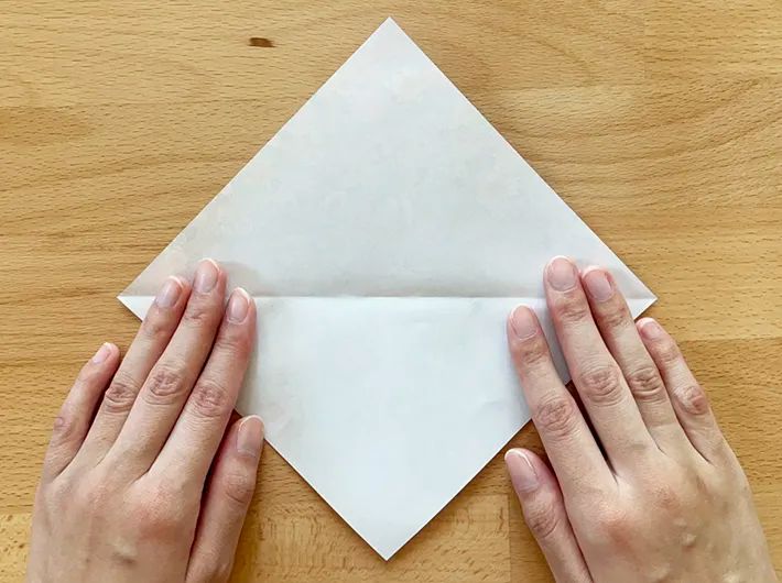 まずは、折り紙を三角に折って開き、折り目をつけてください。
