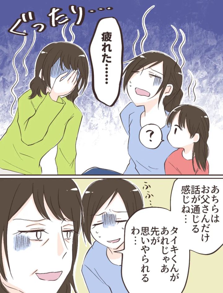 義家族を玄関で見送り、バタンとドアが閉まった瞬間、私と母は「疲れた・・・」とその場に膝から崩れ落ちました。「あちらはお父さんだけ話が通じる感じね、タイキくんがあれじゃあ先が思いやられるわ」ぐったりとした表情で話す母に、私はふふ・・・と力なく愛想笑いします。