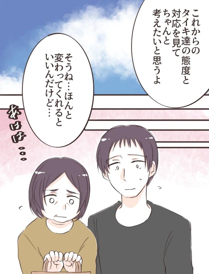 「これからのタイキたちの態度と対応を見てちゃんと考えたいと思う」私がそう笑顔で伝えると、母も微笑みながら「ほんと変わってくれるといいんだけど」と言いました。それから数日後。義父にこっぴどく叱られたのか、自宅に謝りに来たタイキと義母は見違えるほどしおらしくなっていました。私がどれほど傷ついたのか、自分たちがどれだけ酷いことをしていたのかをようやく理解したようで、初めて心からの謝罪を口にします。・・・だからといって、すぐに許すつもりはありませんけどね。