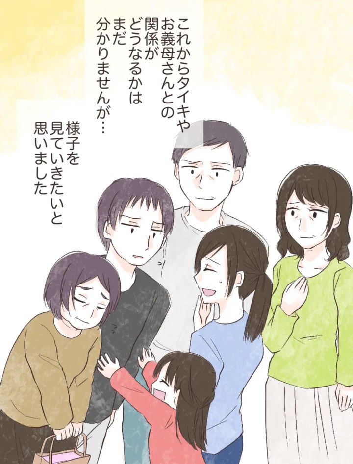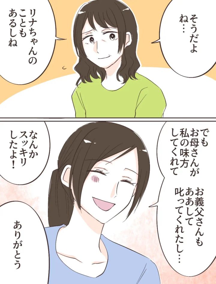 私の思いを伝えると、母は静かにうなずき「そうだよね、リナちゃんのこともあるし」と理解を示してくれました。私は母に「タイキのことはまだ許せないけど、お母さんやお義父さんが味方してくれて、なんかスッキリしたよ!」と感謝の気持ちを伝えました。