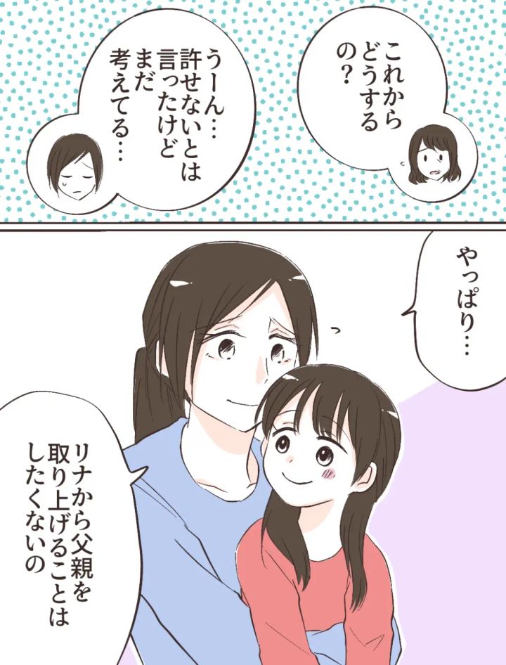 「これからどうするの?」心配そうに問いかける母に、私は「許せないとは言ったけど、やっぱりリナから父親を取り上げることはしたくないの」と正直な気持ちを打ち明けました。自分にとっては最低な夫でも、リナにとってはたったひとりの父親。親のエゴで取り上げるようなことはしたくありませんでした。