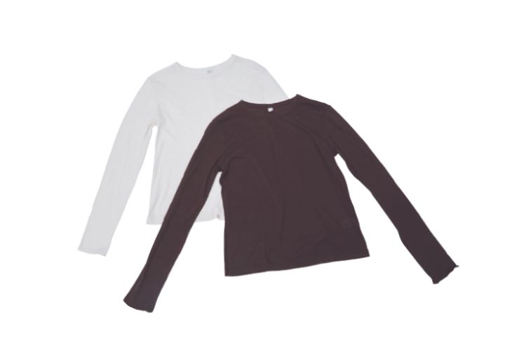 左から・シアークルーネックT(ナチュラル)、シアークルーネックT(茶)各¥990/ともにGU