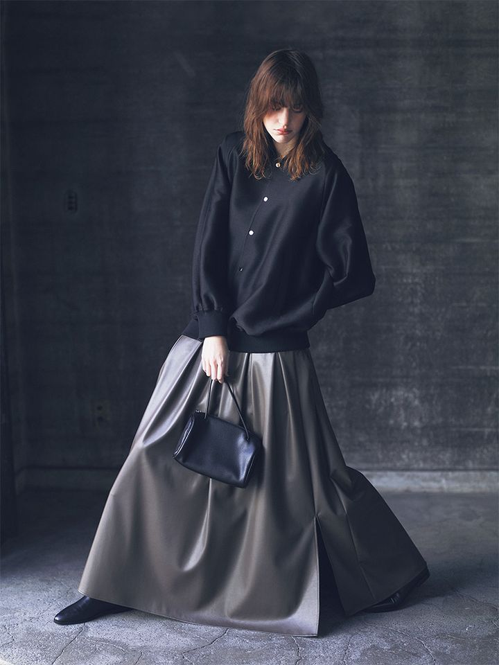 【POINT】似た色、似た質感で上下の境目をあいまいにして、レザースカートをマイルド化。エコレザーならではの軽さと薄さでハードなイメージを塗りかえて、気取って見えない迫力を。