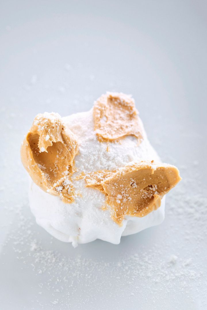 シェフパティシエの名前がついた「ル・メルヴェイユ・ド・マチルダ」。燻製栗のクリームとメレンゲの内側には、きのこのエクストラクションとウイスキーで作ったジュレなどが。 撮影=小野祐次