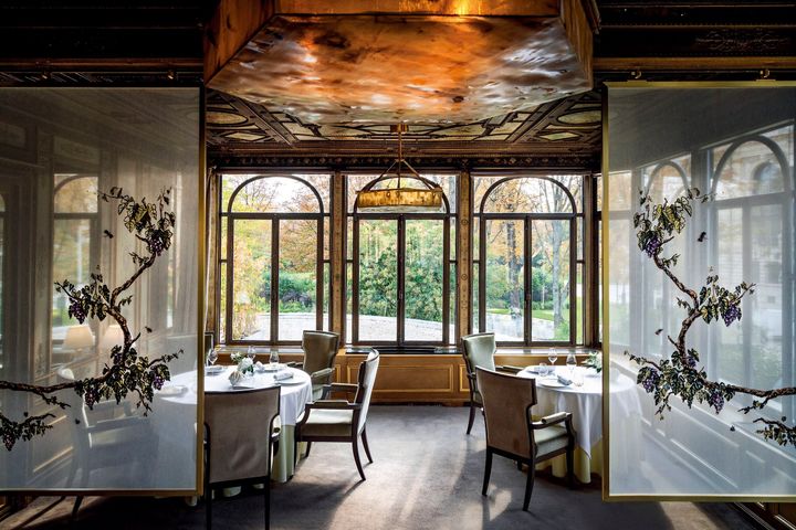 木立に囲まれた新古典主義建築の歴史的な館「パヴィヨン・ルドワイヤン」の2階に位置するヤニック・アレノシェフの旗艦レストラン。来店前に顧客の好みや期待、訪問の目的を把握し、一人一人に合わせたメニューを共創する究極のパーソナライゼーションを実現している。