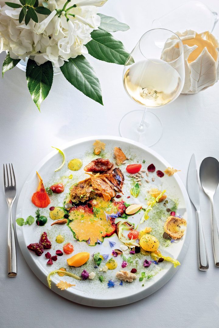 「アレノ・パリ」のスペシャリテ「バラード(散策)」。季節の野菜と果物約30種の食材からなる、菜園の恵みを集結させたようなひと皿。根セロリのエクストラクションとヴァンジョーヌ(ワインの一種)のジュレがすべての要素をつないでいる。 撮影=小野祐次