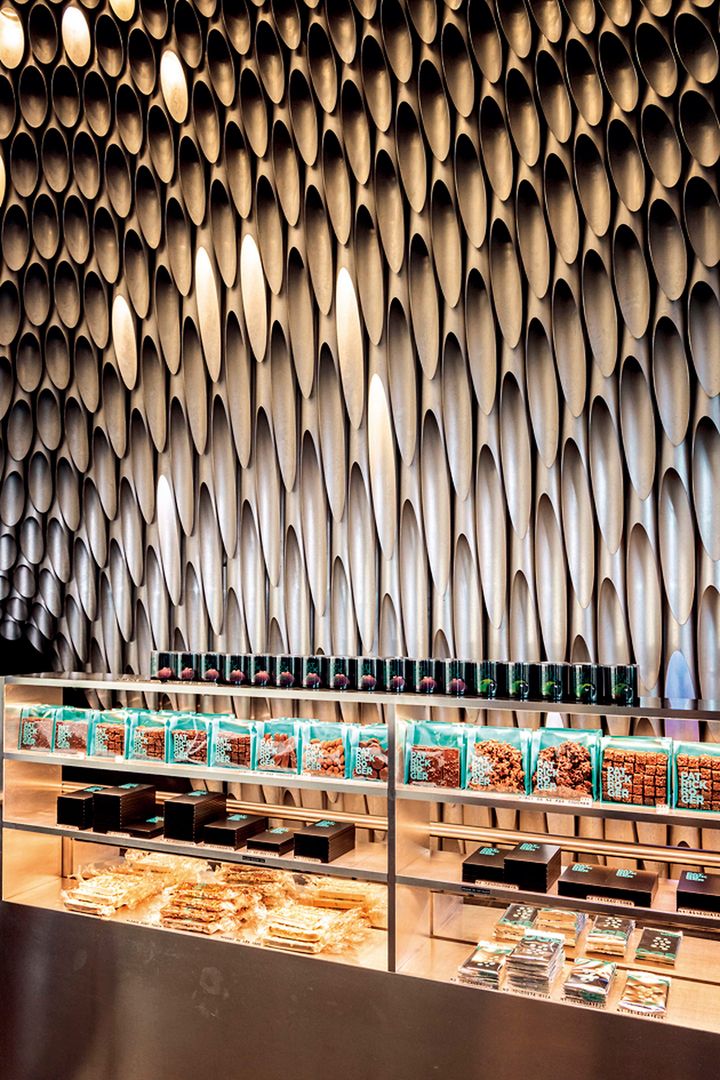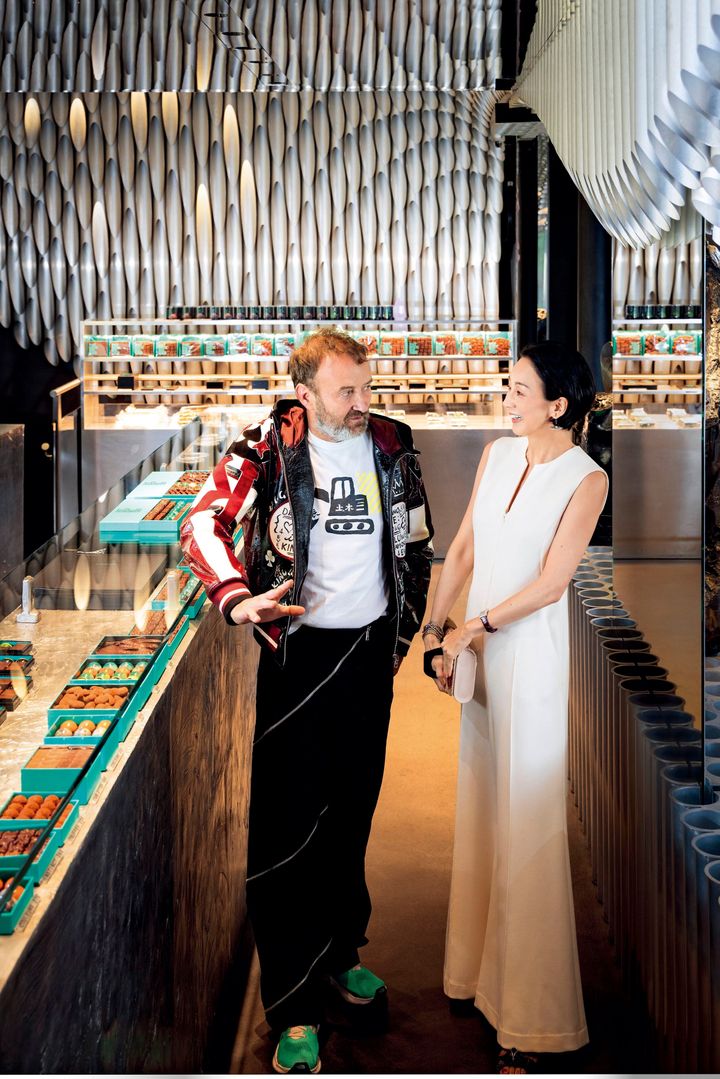 マドレーヌ寺院の向かい側に位置する「パトリック・ロジェ」は、5,000本以上のアルミチューブが蜂の巣状に空間を包み込むような独創的な内装。ショコラへの情熱を語るロジェさんと。2階のギャラリーには、ロジェさんの彫刻作品が並ぶ。 撮影=小野祐次