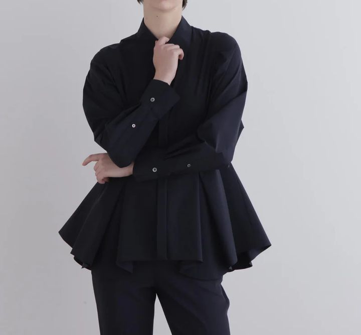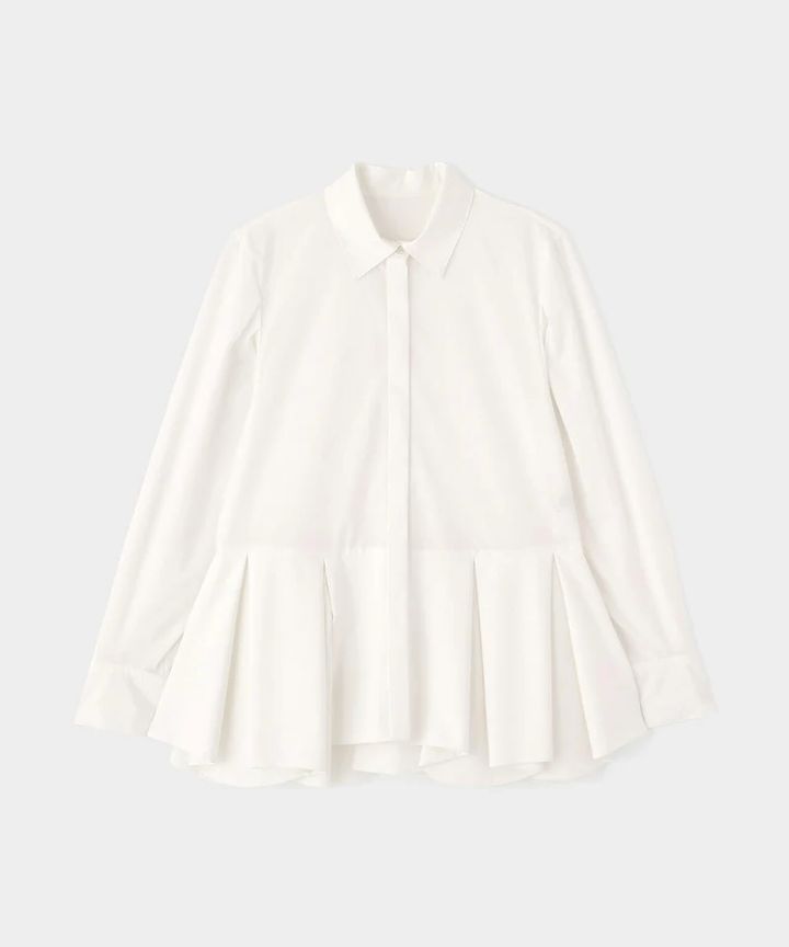 最後にご紹介するのは、軽やかな風合いと機能性を兼ね備えたSOLOTEXブロード素材を使用したブラウスです。特徴は、カーブヘムのタックのペプラムデザイン。タックが開いたときに自然な丸みと揺らぎが生まれるよう計算された設計になっていて、所作を美しく見せてくれるんですよね。花びらを想起させるような柔らかな曲線が、華やかで上品。フロント部分はシンプルなシャツのような仕様になっているので、すっきりとシャープさも兼ね合わせています。他色展開のアイテムで、カラーによって印象がガラッと変わるので、ぜひ店頭でチェックしてみてください。写真のホワイトはクリーンさが魅力です。