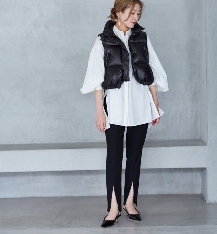 しっかりポケットもあり、一見するとごく普通のテーパードパンツのように見えます。同じような素材感で、フロントスリットではなくサイドジップタイプもあるので、お好みでチョイスしてみてくださいね。カラー展開はブラック、ホワイト、ネイビー。お仕事シーンにはもちろん、お子さんのいらっしゃる方は学校行事にも対応できると購入されることも多いそうですよ。