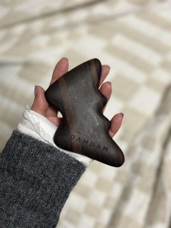 黒檀の端材から作られ、柄の出方などがひとつずつ違う1点ものの「ダムダム」のかっさ。縞々のグラデーションや人間工学に基づいて作られた形が美しく、そのまま置いておいても絵になるところがお気に入り。軽くてお風呂でも使え、カビが生えにくく、もちろん充電も不要。バッグやポケットにするりと入れて、移動先や旅行先でも気軽に使えるのがとっても便利!