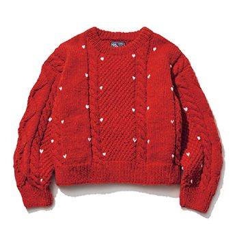 メンズライクな地厚ケーブルに、コンパクトな丈感と散りばめられたハートで大人の可愛げを。強い色だからこそ、これくらいの遊び心でハズすのがちょうどいい。