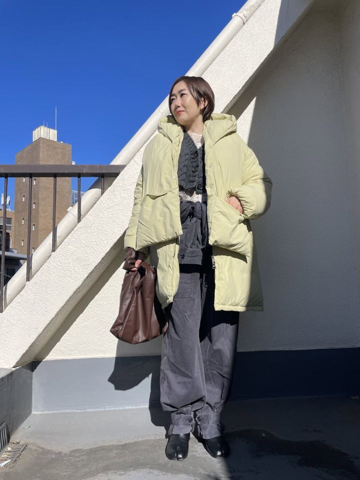 取り外し可能なフーディ付きスカーフがついた、ひとクセあるデザインが目をひくダウンジャケット。グレーのコーデに羽織りニュアンストーンでまとめると、華やかなカラーもスタイリングに馴染んでくれて◎。