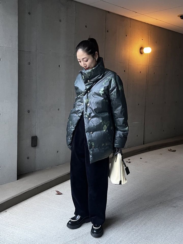 一見ブラックのシンプルなダウンコートですが、よく見るとグリーンの模様があしらわれた一枚。ブラックコーデのクールな雰囲気はそのままに、まわりと差がつく個性的な着こなしにシフトしてくれます。