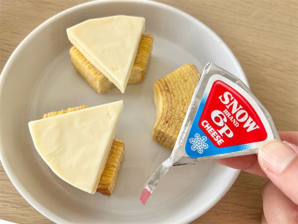 市販のバウムクーヘンに、子どもの頃からおなじみの6Pチーズをのせてチンしただけなのに、まるでワンランク上の焼き菓子のよう。