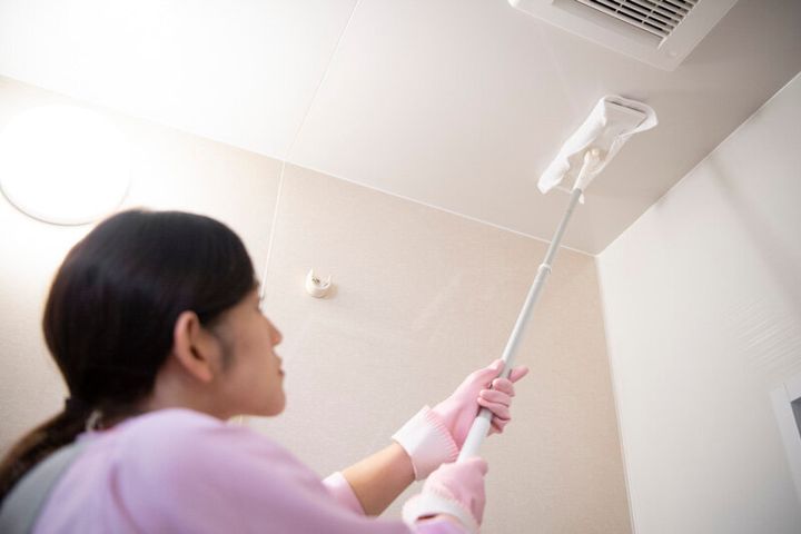 (1)フローリングワイパーに、ぬらして堅く絞った掃除用クロスを装着する。クロスに浴室用中性洗剤をかけ、天井を拭く。