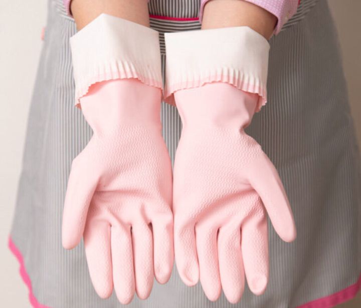 ●洗剤を使用するときは、充分に換気し、ゴム手袋を着用しましょう。ゴム手袋のすそを外側に折り返しておくと、手袋についた洗剤や汚れが腕にたれ落ちるのを防げます。