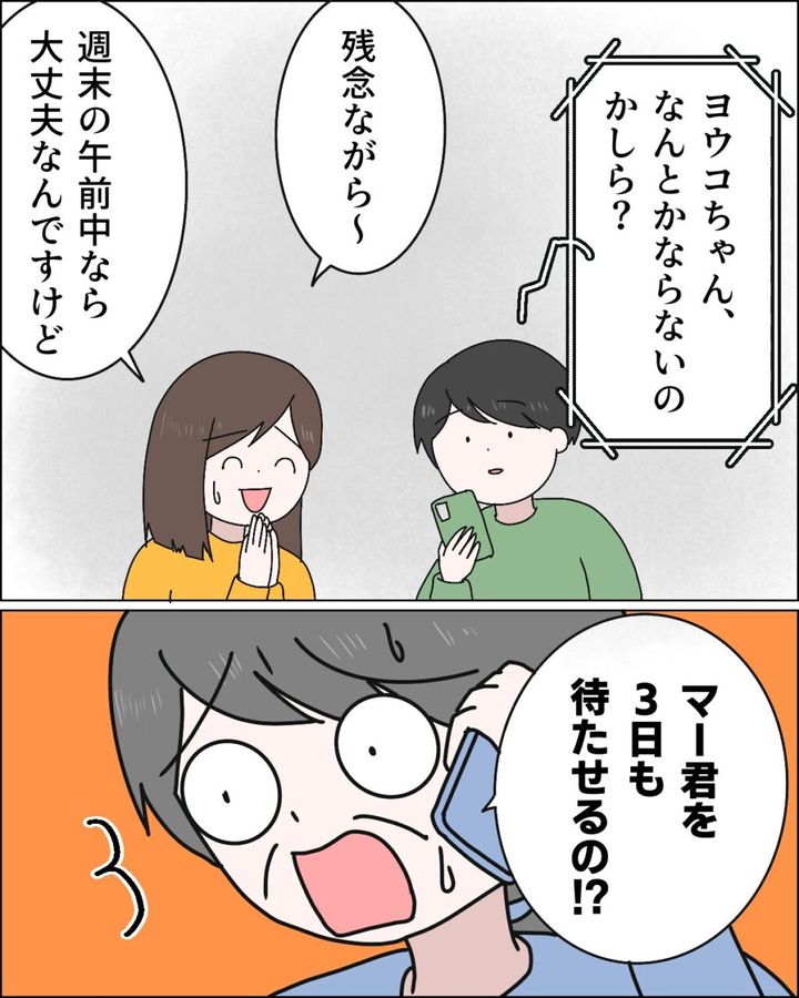 「ヨウコちゃん、なんとかならないのかしら?」と食い下がってくる義母に「残念ながら~。週末の午前中なら大丈夫なんですけど」と返すと、義母は信じられないといったように「マー君を3日も待たせるの!?」と叫びました。