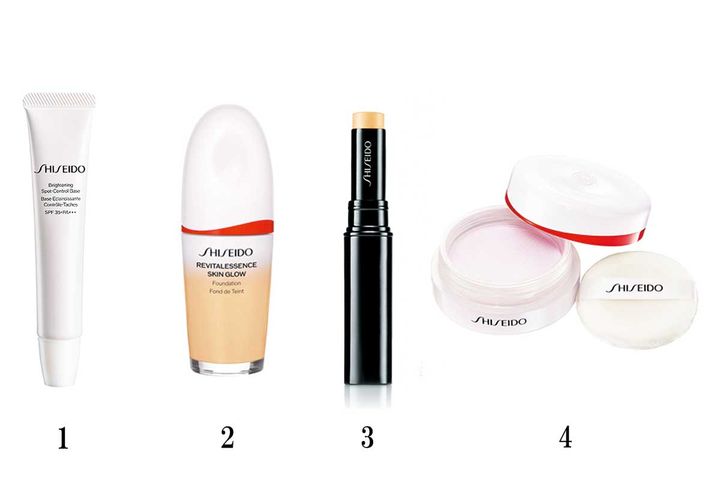 眉間、鼻の横、あご先に4をパフでふんわりとのせ、ツヤを抑える。これにより頬などのツヤ感が際立ち、ハイライトいらずに。
