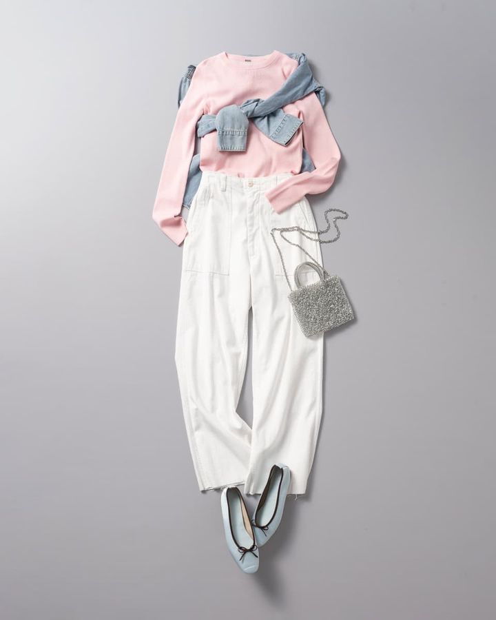 ピンクのトップスが映えるホワイトのベイカーパンツが甘派の大人カジュアルにもマッチ!ちょっぴり苦手意識のあるカジュアルスタイルも、ホワイトを選べば甘さをキープしつつカジュアルすぎないから、自信を持って着こなせそう。