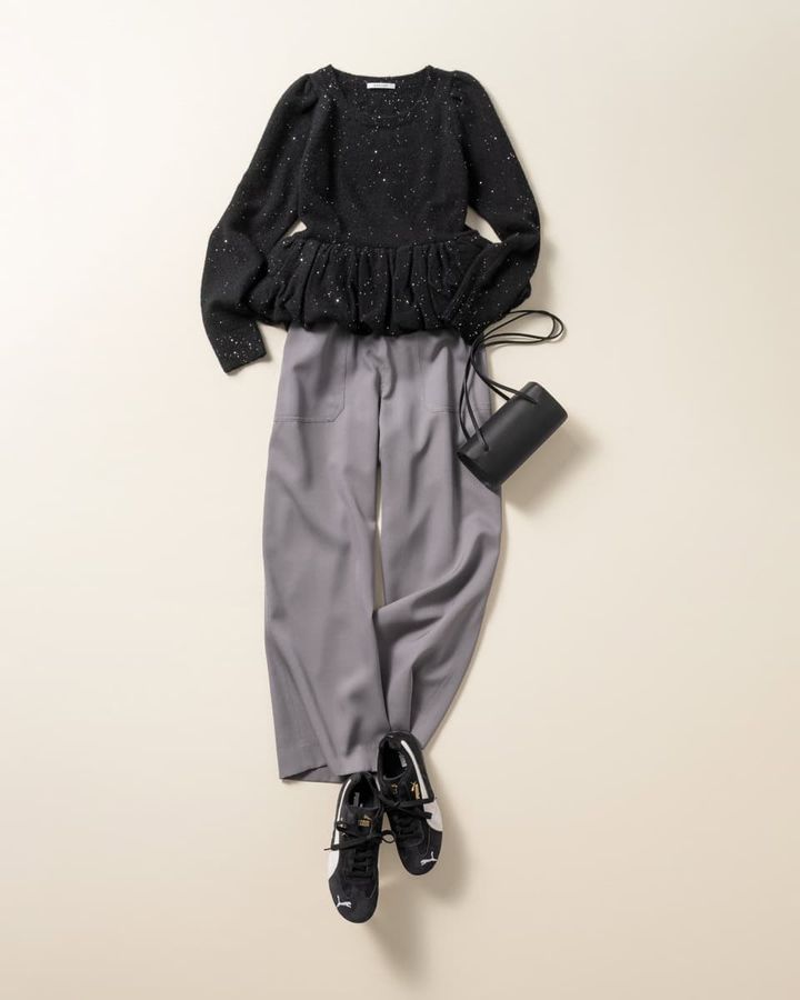 パンツ¥35,200(ロエフ/エイチ ビューティー&ユース)ニット¥22,000(カデュネ/カデュネ プレスルーム)バッグ¥126,500(フェイン/アルアバイル)シューズ¥15,400(プーマ/プーマ お客様サービス)
