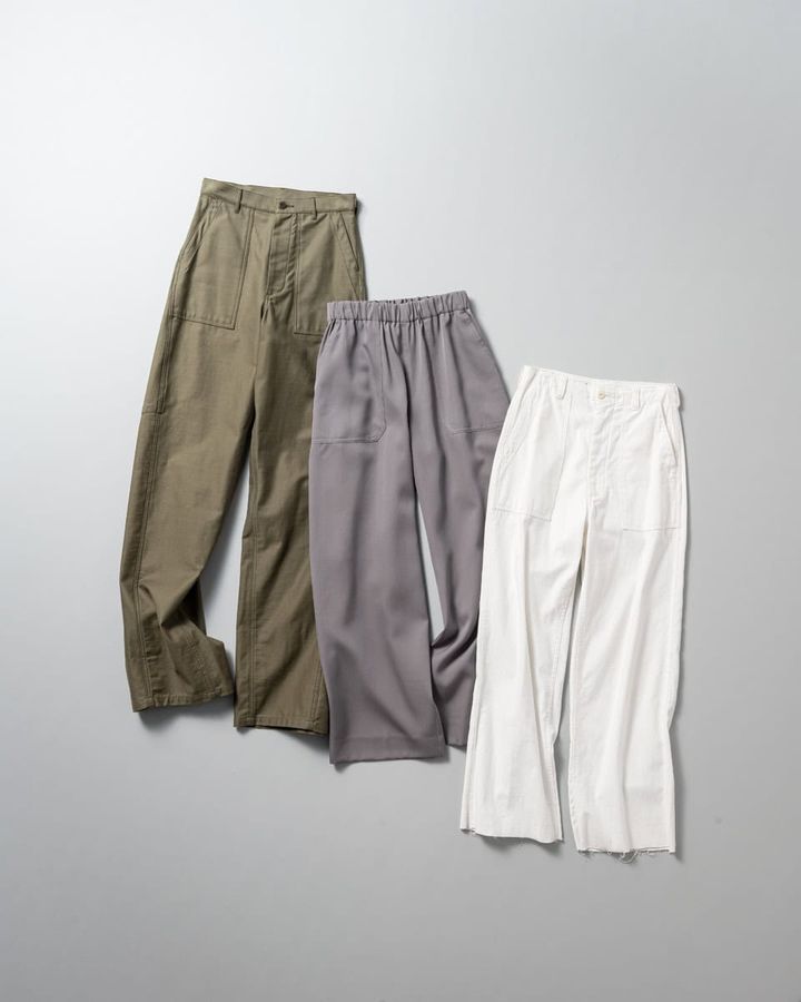 [左から]カーキパンツ¥30,800(ハイク/ボウルズ)、グレーパンツ¥35,200(ロエフ/エイチ ビューティー&ユース)、ホワイトパンツ¥57,200(マディソンブルー)
