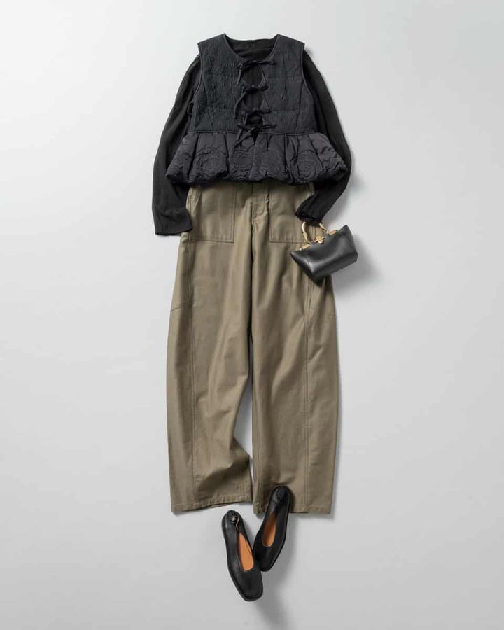 全体をモノトーンで無難にまとめずにカーキの変化球でモードに寄せて今っぽく更新!パンツ以外を全てブラックでまとめるとリッチな着映え感を纏ってより洗練された印象に。