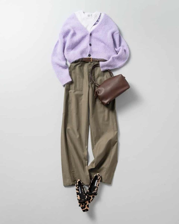 ラベンダーが映えて目を引くニットカーディガンにはカーキ合わせが新鮮!トレンドのレオパード柄とも好相性で一気に垢抜けた印象に。トップスを短丈でコンパクトにまとめてベルトマークをすればスタイルアップも叶います。