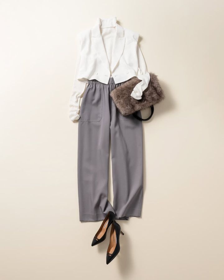 コンサバ派が得意とするキレイめコーデはワンパターンに陥りがち。そこで、ボトムスのカラーをグレーに変えるだけで一気に更新感が出ます。体型カバーを叶えるベイカーパンツに短丈ジレを合わせることで更なるスタイルUP効果も!