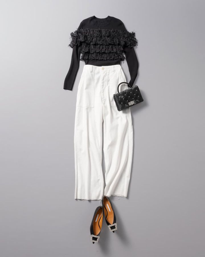 フリルが目を引く華やかな印象のトップスにはスカートで甘さを重ねるよりも程よく甘さを軽減し、抜け感を醸してくれるホワイトのベイカーパンツを合わせて鮮度UPを狙って。甘さ控えめな大人のモノトーンで洗練感が際立ちます。小物を黒で統一すればよりシックな佇まいに。