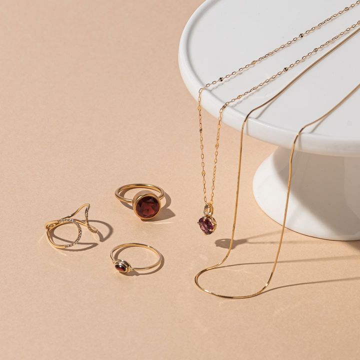 (右から)スキンネックレス[K18YG]¥162,800(ジジ/ジジ表参道店) ガーネットチャーム[K18YG、ロードライトガーネット×DIA]¥66,000チェイン[K18YG]¥71,500(ともにスタージュエリー/スタージュエリー表参道ヒルズ店) (上)ガーネットリング[K18YG]¥231,000(マリハ) (下)ガーネットリング[K10YG]¥41,800 スキンリング[K18YG]¥132,000(ともにete)