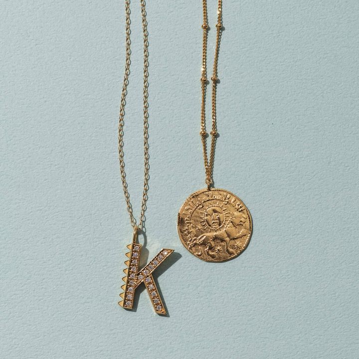(左から)イニシャルペンダントトップ[K18YG、DIA0.3ct]¥462,000チェーン[K18YG]¥121,000(カドー/CADEAUX六本木ヒルズ店) コインネックレス[SV925×K18YGP]¥28,600(マリハ)
