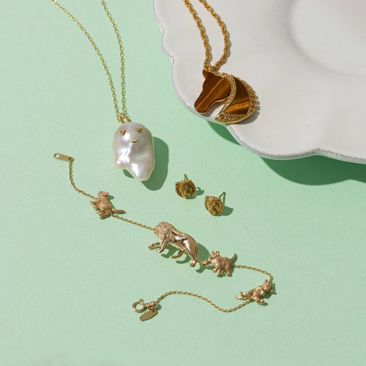 (上から)馬ペンダント[合金、YG、キュービックジルコニア]¥36,300(ヴァンドームブティック/ヴァンドームブティック 大丸東京店) おばけペンダントトップ[K18YG、淡水真珠バロック]¥108,900チェーン[K18YG]¥121,000(カドー/CADEAUX六本木ヒルズ店) ライオンピアス[K18YG]¥90,200(ジジ/ジジ表参道店) ライオンブレスレット[K10YG]¥220,000(ヴァンドームブティック/ヴァンドームブティック 大丸東京店)