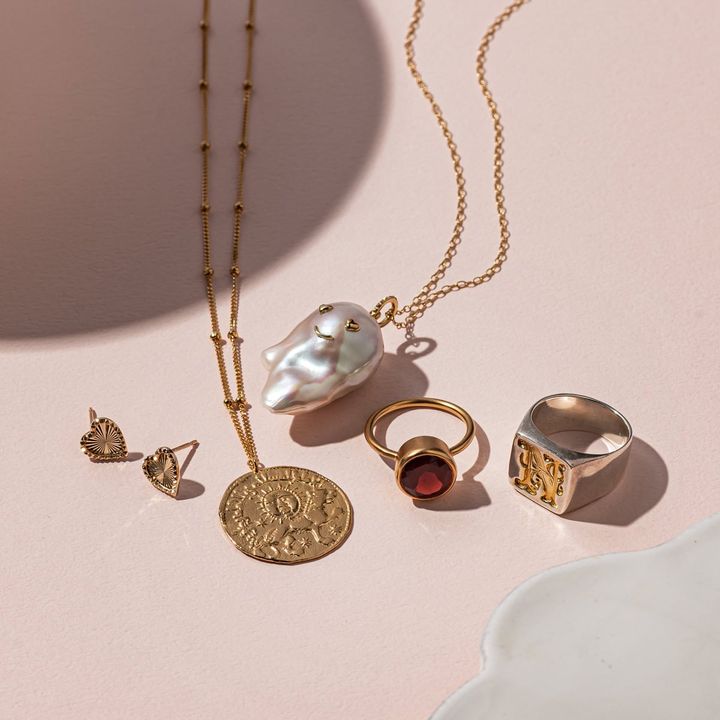 (左から)ピアス[K10]¥74,800(スタージュエリー/スタージュエリー表参道ヒルズ店) ライオンネックレス[K18YPP]¥28,600(マリハ) おばけペンダントトップ[K18YG、淡水真珠バロック]¥108,900チェーン[K18YG]¥121,000(カドー/CADEAUX六本木ヒルズ店) ガーネットリング[YG]¥231,000(マリハ) リング[スターリングシルバー950、18Kゴールドメッキ]¥41,800(ノアーク/ノウン)