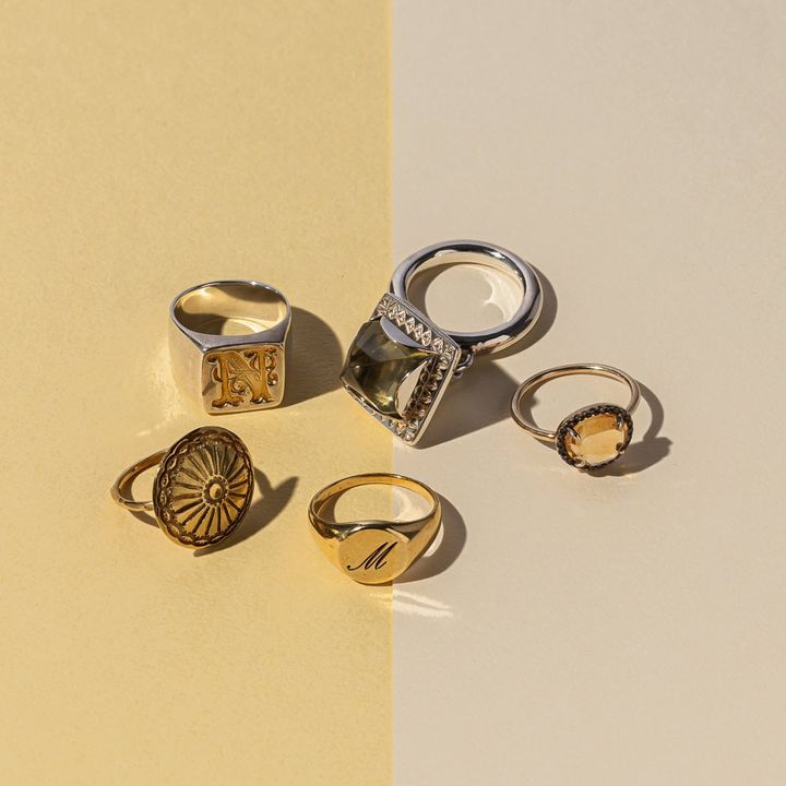 (左から)リング[K18YG]¥189,200(ジジ/ジジ表参道店) リング[スターリングシルバー950、18Kゴールドメッキ]¥41,800(ノアーク/ノウン) リング[SILVER925+K18YG plating]¥17,600~470,800※素材により価格が変わります、表記と価格が変動する可能性がございます(アルティーダウッド) リング[スターリングシルバー950]¥110,000(ノアーク/ノウン) リング[SILVER925+K18YG platingシトリン ダイヤモンド]¥29,700※表記と価格が変動する可能性がございます(アルティーダウッド)