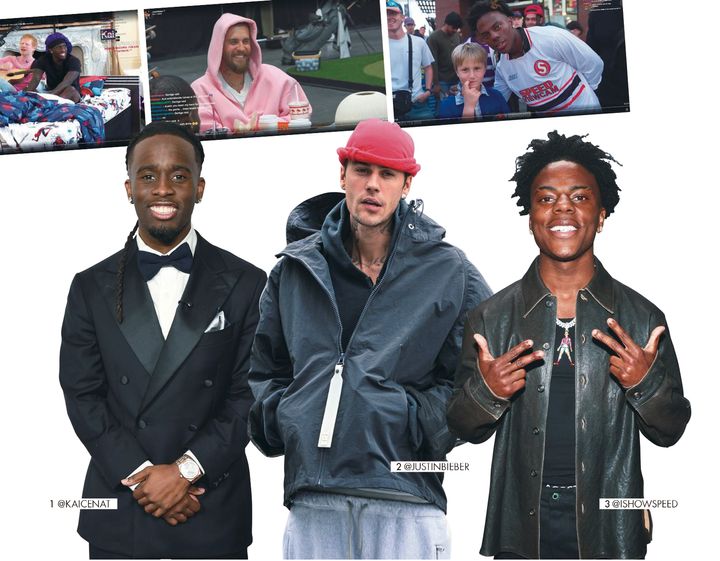 【1】1カ月間配信中に、エド・シーランの生歌で起床する姿を見せたカイ・セナット。Twitch登録者数2000万人以上。【2】ジャスティン・ビーバーも最近Twitchを開設したことが話題に。【3】2大ライブ配信スターのもうひとりは、アイ・ショー・スピード。弱冠20歳でYouTube登録者数4600万人以上。 TWITCH, Getty Images