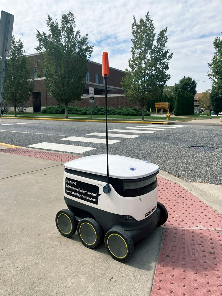 小さめの段ボールくらいのサイズで道路を横断するスターシップ社の配達ロボット。LAだと街なかも普通に走っている。 Getty Images