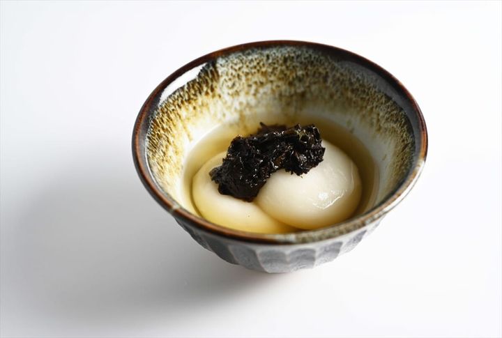 奥出雲・仁多のもち米でつかれた弾力のある丸餅を、あごだしのつゆで温め、香り豊かなもちのりを添えたお雑煮。ひと口味わえば磯の香りが広がる一品です。