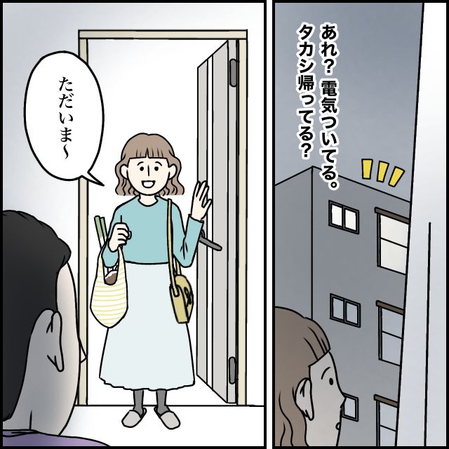 仕事で少し遅くなった私は、家の前に着いたときに「あれ?電気ついてる。タカシ帰ってる?」と驚き、急いで部屋へ。「ただいま~」と言うと、なんだか暗い表情のタカシが。