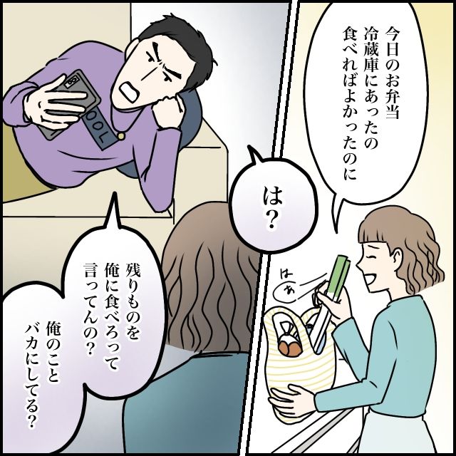 「今日のお弁当、冷蔵庫にあったの食べればよかったのに」と買い物してきたものを取り出しならそう言うと、「は?残りものを俺に食べろって言ってんの?俺のことバカにしてる?」とタカシが怒り出し、
