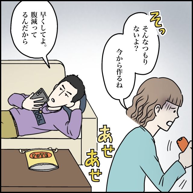 「遅くない?」ソファに寝っ転がってスマホ片手にそう言うタカシ。おやつにスナックを食べたんだなと思いつつ、「ごめん。残業で。タカシは今日早いね」と言うと、「それより、お腹すいたんだけど?」とタカシに言われ、