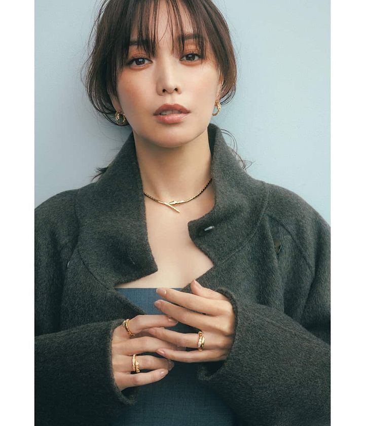 すべて「セルペンティ ヴァイパー」ネックレス〈YG〉¥2,046,000ピアス〈YG×Dia〉¥819,500リング右手(薬指)〈YG×Dia〉¥1,661,000(人差し指)〈YG〉¥389,400リング左手(薬指)〈YG×Dia〉¥643,500(すべてブルガリ/ブルガリ・ジャパン)コート¥132,000(クリスチャン アクス/ウィム ガゼット 玉川髙島屋S・C店)オールインワン¥34,100(HER.)