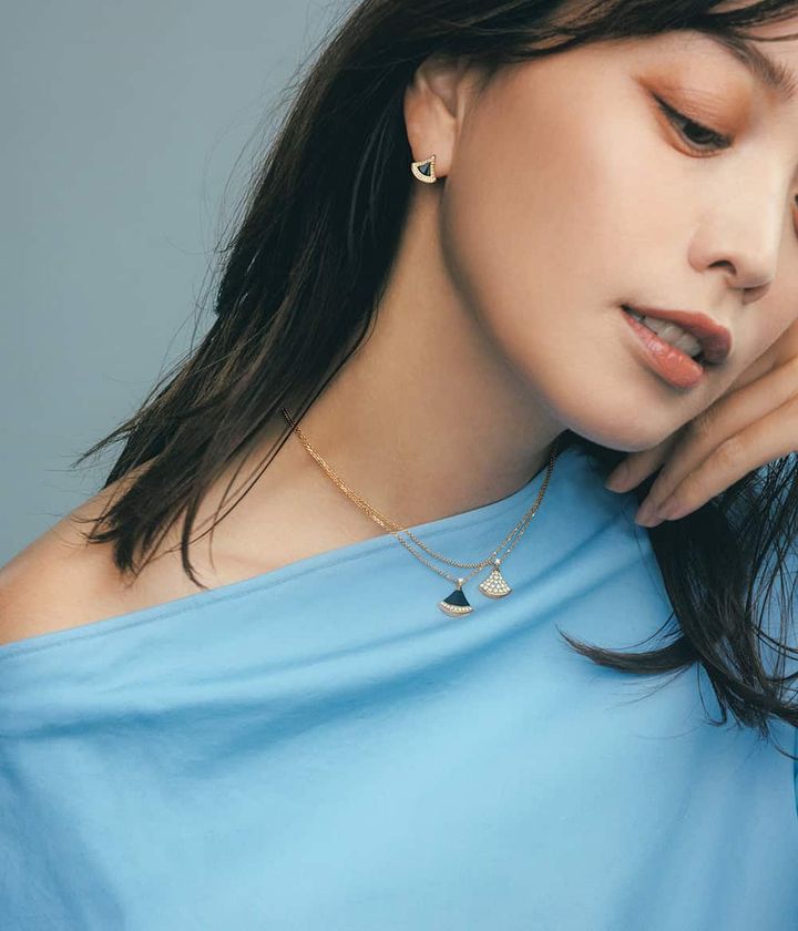 すべて「ディーヴァ ドリーム」ネックレス左〈YG×オニキス×Dia〉¥561,000 右〈YG×Dia〉¥1,309,000ピアス「ディーヴァ ドリーム」〈YG×オニキス×Dia〉¥497,200 (すべてブルガリ/ブルガリ・ジャパン)シャツ¥25,300(ウィム ガゼット/ウィム ガゼット 玉川髙島屋S・C店)