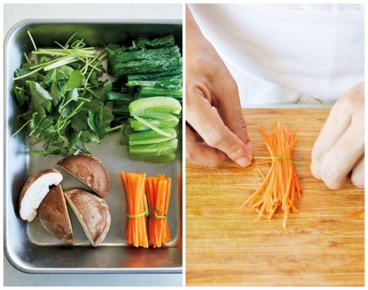 にんじんは皮をむいて せん切りにし、2等分 にしてそれぞれゆで三つ葉で縛り、両端を切って形を整える。三 つ葉は長さ3~4㎝に 切る。しいたけは軸を切り、半分に切る。小松菜は30 秒ほどゆで、水にとって(湯は捨てない)絞り、根元を切って 長さ4㎝に切る。鶏肉は余分な脂肪を除き、一口大のそぎ切りにする。同じ 湯に鶏肉をさっとくぐらせて表面に火を通す(中まで通さなくてよい)。