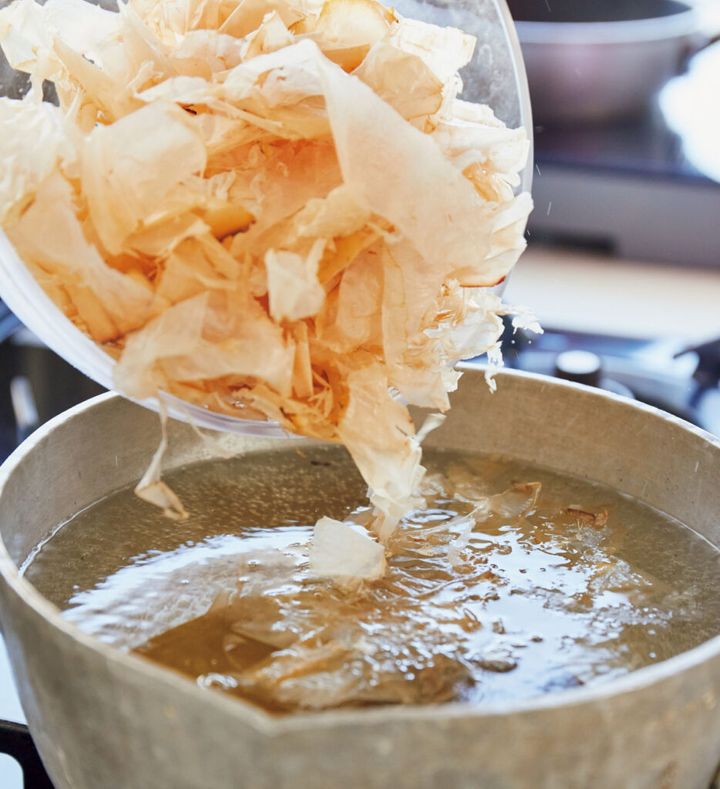 沸騰直前に昆布を取り出し、削り節を加えてひと煮立ちさせたものを「一番だし」、昆布と削り節を水から煮出した濃厚なものを「二番だし」といいます。前者は香りが強く、後者はうまみが強い。この2つの特徴を生かすのが「1.5番だし」。弱火で適度に煮出すので、香りを残しつつ、うまみも引き出せるというわけです。