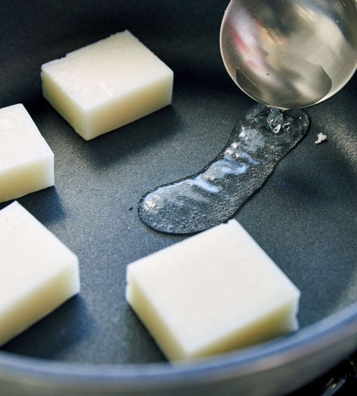 餅は横に半分に切る。フライパンを中 火で1 分ほど温め、餅を並べる。餅に かからないように水大さじ1を入れ、 ふたをして弱火で2 分ほど蒸し焼きに する。ふたを取って餅を返し、焼き目がつくまで中火で2~3分焼く。