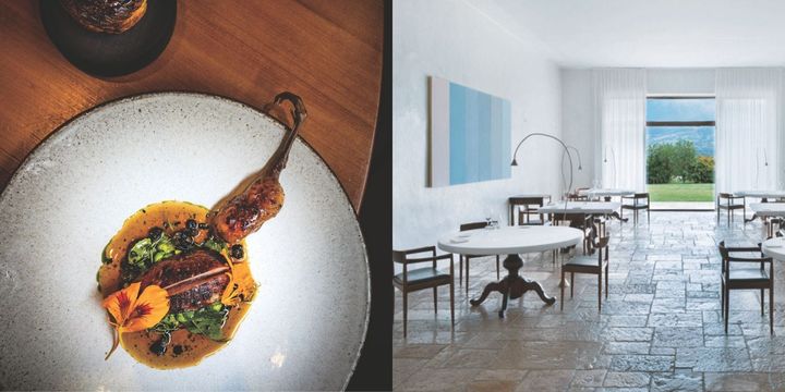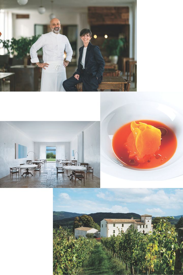 写真すべて「レアーレ」。上/シェフのニコ・ロミートと、妹でマネージャー兼ホール責任者のクリスティアナ・ロミート。中央右/濃厚なペースト、にんじん抽出液に漬け込んだ薄切り、紙包み焼き、グレーズなどいくつもの調理法を施したにんじんを味わう「にんじん」。中央左&下/16世紀の修道院を改装したレストラン。客室と料理学校と研究機関「アカデミア・ニコ・ロミート」を併設。