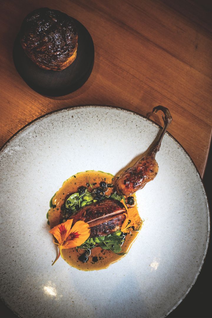 写真/「エクステッド」のテイスティングコースより、北欧らしい素材使いが光る「ジュニパーで燻製したうずら ローズビネガーと青豆添え」。すべて薪火で調理。